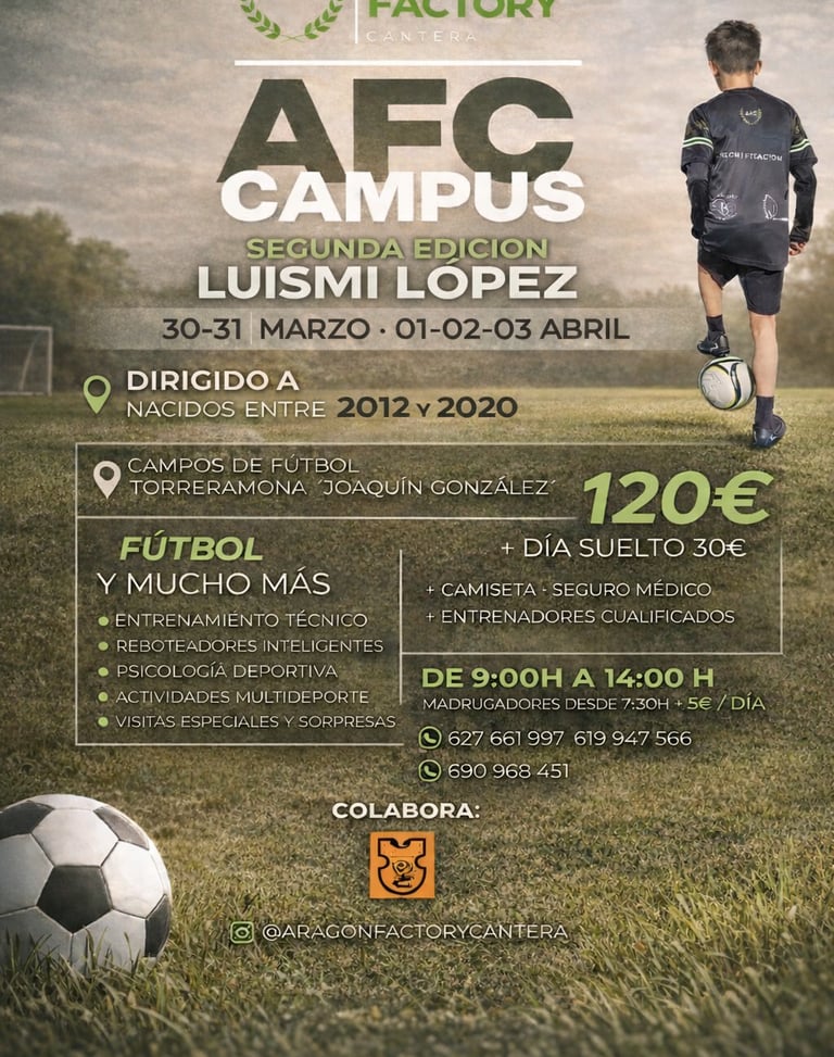 Estas vacaciones de Semana Santa 2026, Aragón Factory Cantera lanza su AFC Campus de Semana Santa, un proyecto pensado para que niños y niñas disfruten del fútbol, aprendan valores y vivan días llenos de actividad, deporte y diversión.