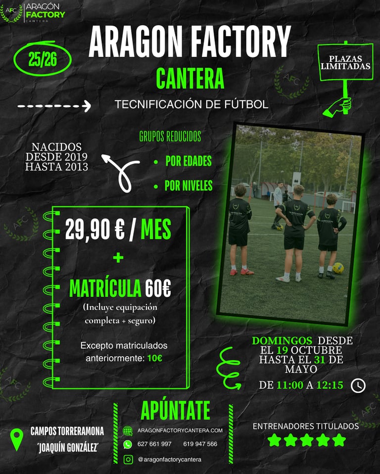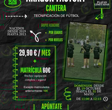 En Aragón Factory Cantera ofrecemos un programa de tecnificación de fútbol de alto nivel dirigido a jugadores nacidos entre 2013 y 2019. Nuestro objetivo es potenciar al máximo el rendimiento del deportista, trabajando en grupos reducidos por edades y niveles para garantizar una atención personalizada. Contamos con un equipo de entrenadores titulados y especializados, que guían cada sesión con metodología moderna y adaptada a las necesidades de cada jugador. Además, disponemos de material innovador como reboteadores inteligentes y recursos de última generación, que nos permiten optimizar la técnica y la toma de decisiones en el juego.
